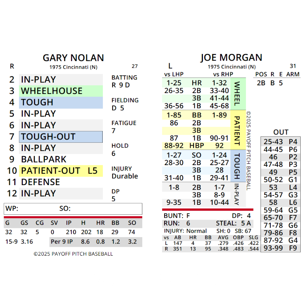1975 season set for Playoff Pitch Baseball. This card set includes individual player cards with ratings based on each players actual performance vs Left-Handed and Right-Handed pitchers. Players receive a card for each team they played for during the regular season as well as a combined totals card.