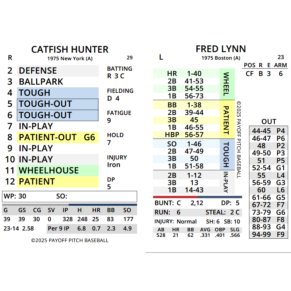 1975 season set for Playoff Pitch Baseball. This card set includes individual player cards with ratings based on each players actual performance during the regular season. This is the standard set and does include L/R Splits. Players receive a card for each team they played for during the regular season as well as a combined totals card.